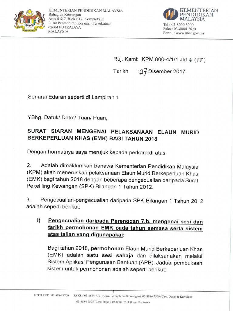 Elaun Murid Khas EMK merupakan antara kemudahan yang diperolehi oleh murid pemegang kad OKU selagi mereka belajar di sekolah-sekolah kerajaan pusat-pusat Pemulihan Dalam Komuniti mahupun pusat-pusat pendidikan anak-anak istimewa kelolaan NGO yang diiktiraf. Taklimat hari pendaftaran tahun 1 2018. Cikgu ada x pekeliling ttg bayaran elaun guru pendidikan khasmohon sharetq.
