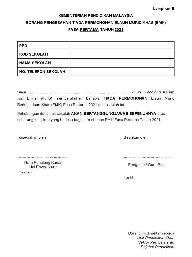 Lampiran B Kementerian Pendidikan Malaysia Borang Pengesahan Tiada Permohonan Elaun Murid Khas Emk Fasa Pertama Tahun 2021 Pdf